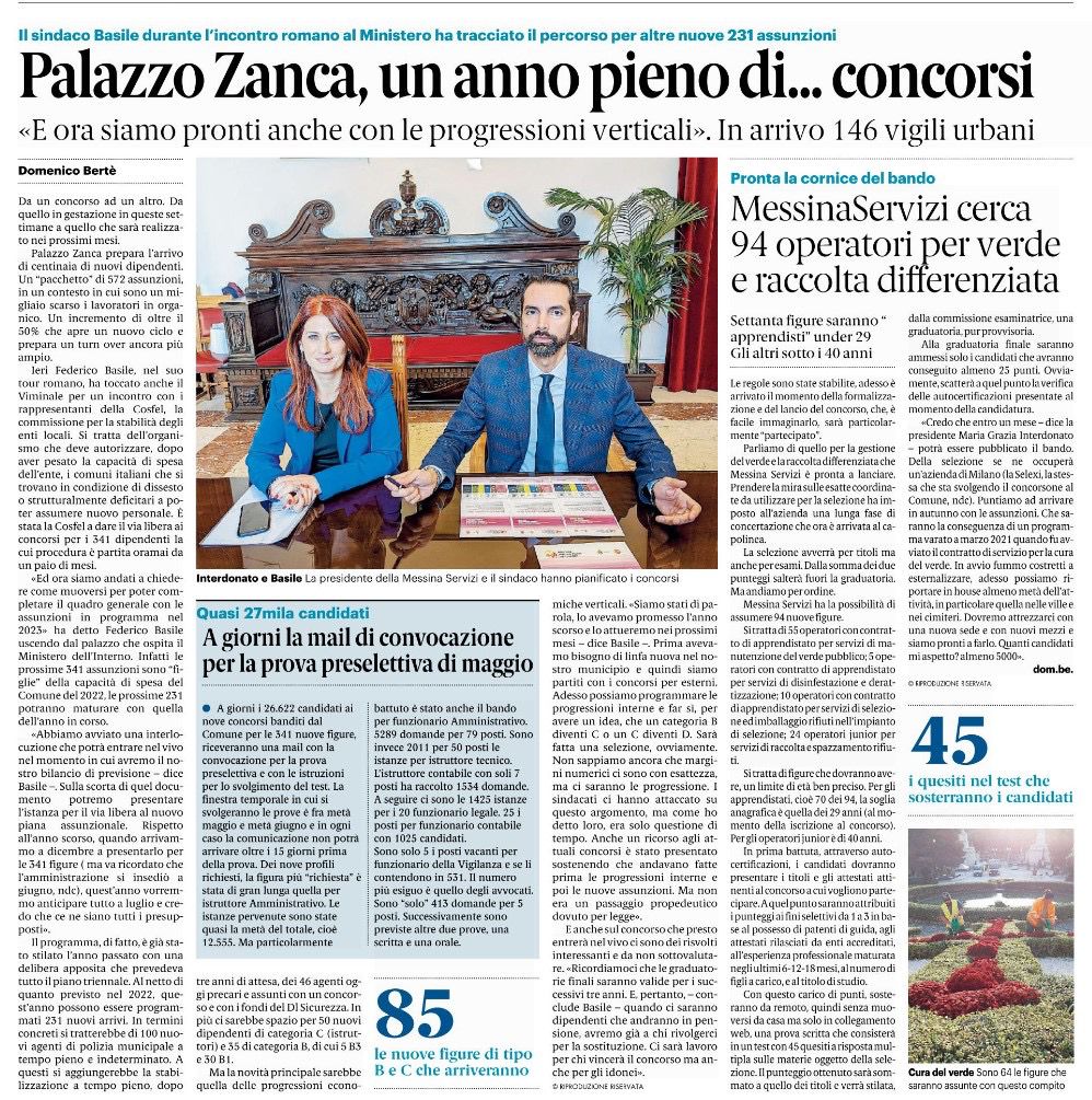 Rassegna stampa del 13.04.2023 Palazzo Zanca un anno pieno di concorsi. Messinaservizi 94 operatori per verde e raccolta differenziata 13 Aprile 2023 . da stampa Rassegna stampa giornali cartacei La Gazzetta del Sud